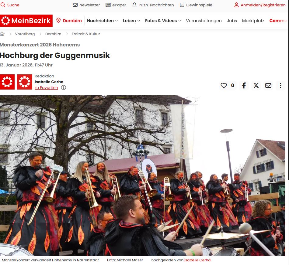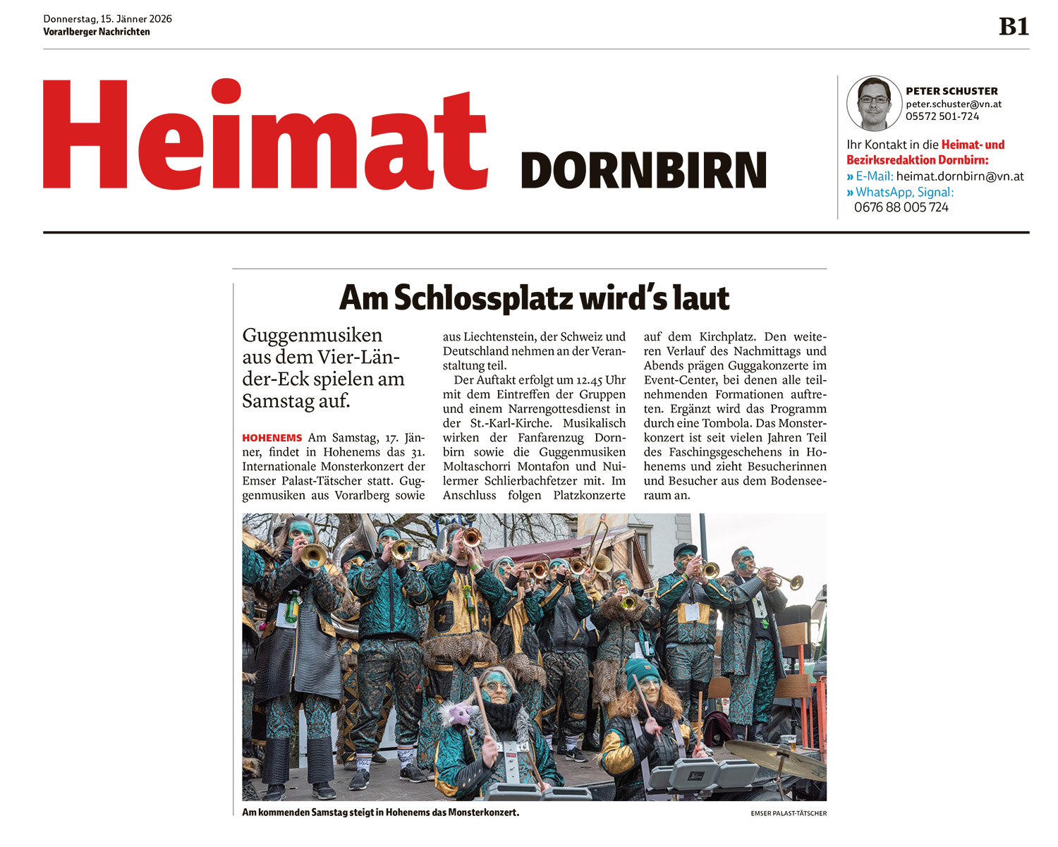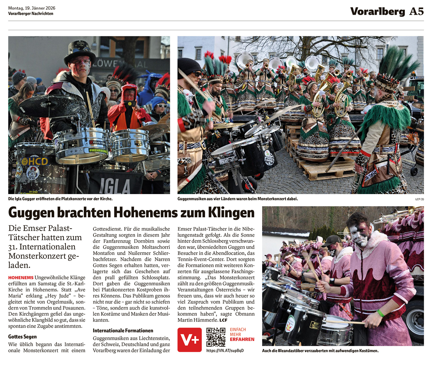 Medienberichte 2026 Beitrag auf ORF – Vorarlberg heute & ORF ON VN Bericht 19. Jänner VN -Titelseite 19. Jänner Vorbericht „VN-Heimat“ Vorbericht auf „Mein Bezirk“ 31. Internationales Monsterkonzert bringt Guggenpower ins Ländle